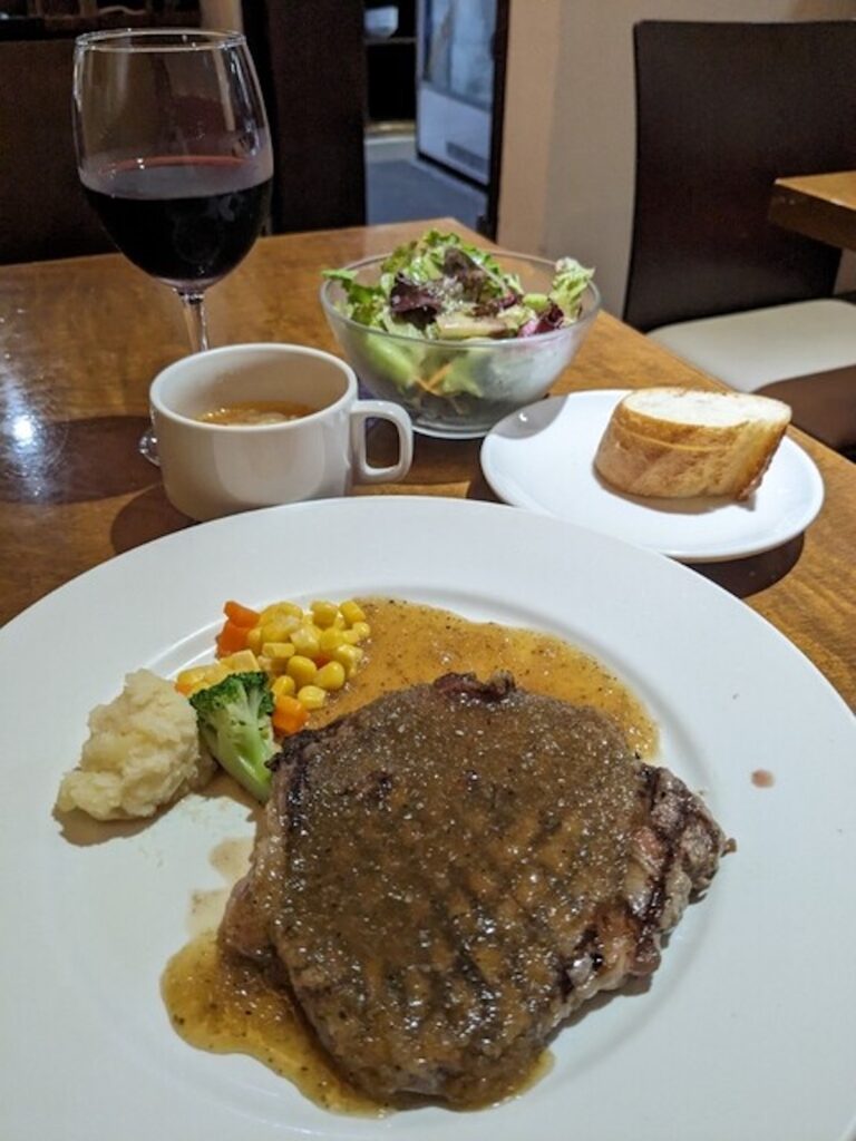 こちらの「ステーキランチ」は、パンもしくはライス・サラダ・スープが付いて1,200円。