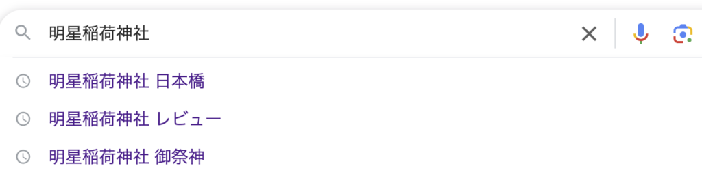 Googleの検索窓に「明星稲荷神社」と入力してみると、以下のように「明星稲荷神社 レビュー」というキーワードが表示されました。