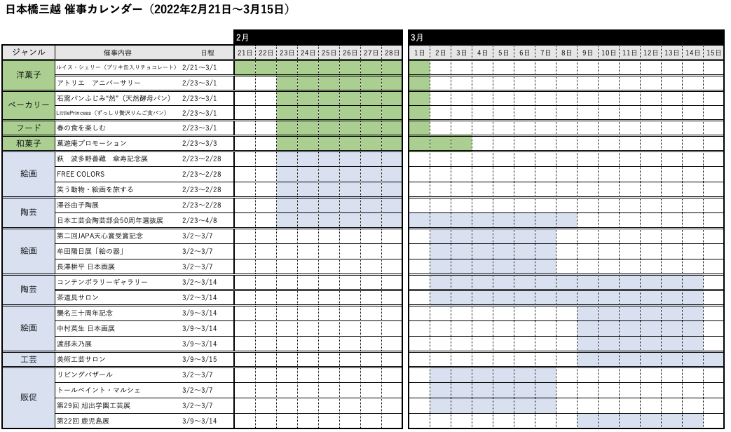 こちらが2022年2月時点の日本橋三越の催事情報のまとめとなっております。